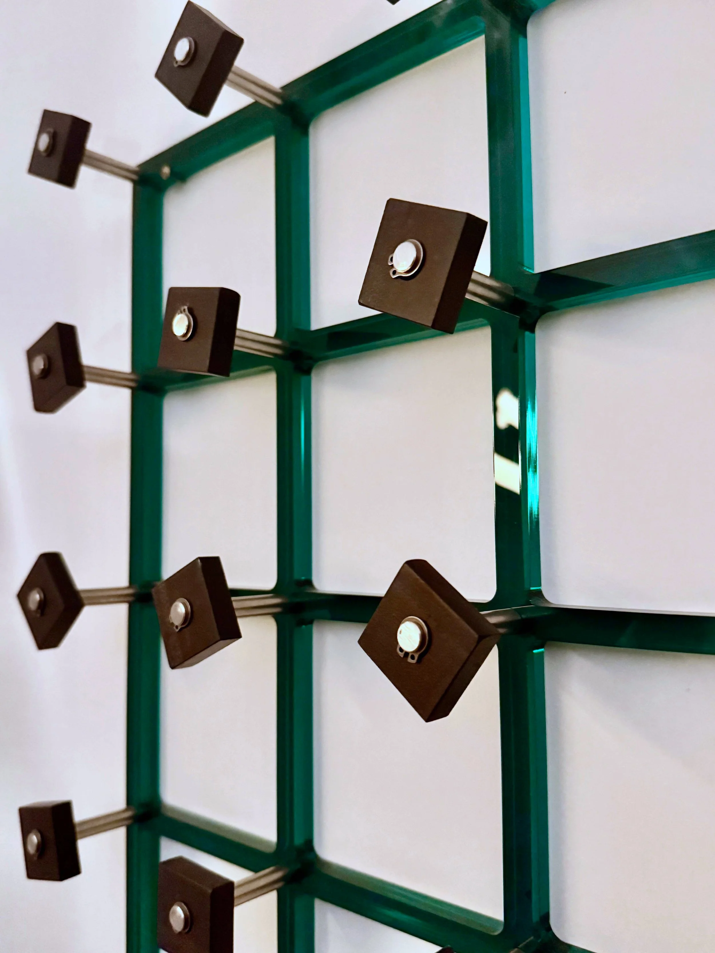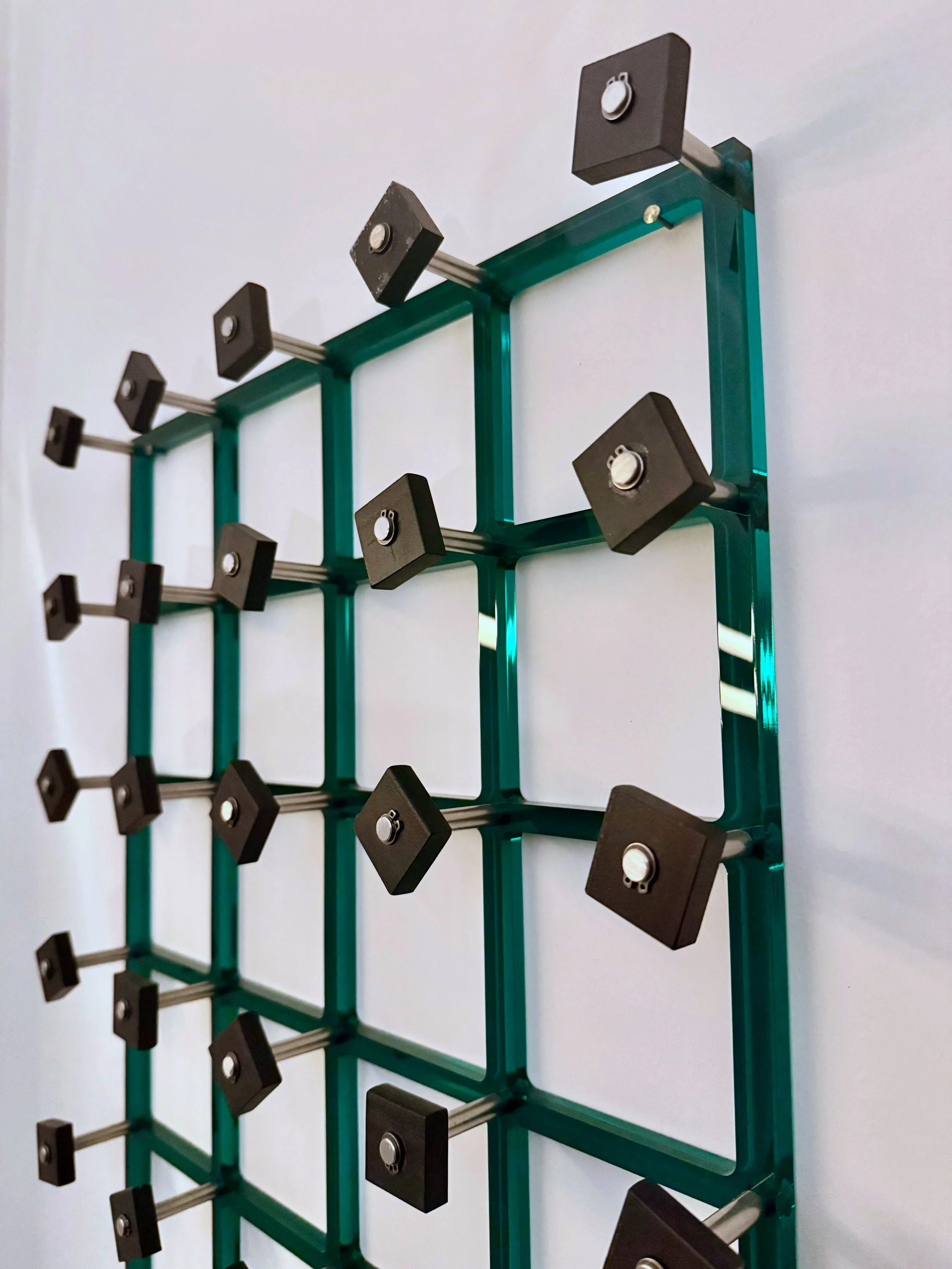 Within this framework the work Entropy, March 23 aims to represent the indifferent, chaotic and harmonious balance between the parts. The neat, shiny, transparent grid represents the idealization of order, of the society of the world understood as a set of deterministic rules and flows; the stainless pins represent the distance between the idealization and reality, which, finally, is represented by the squares, all the same in appearance, but different because of small imperfections in the material and, above all, because of their position in relation to each other: Although there may be a moment when the squares are aligned along the grid all in the same position, this moment will last very little because it will only take any external event, even the slightest, to move them and make them rotate and thus fall a new position of indeterminate equilibrium, which, however, does not correspond with the aesthetic and therefore rational equilibrium decided by man.