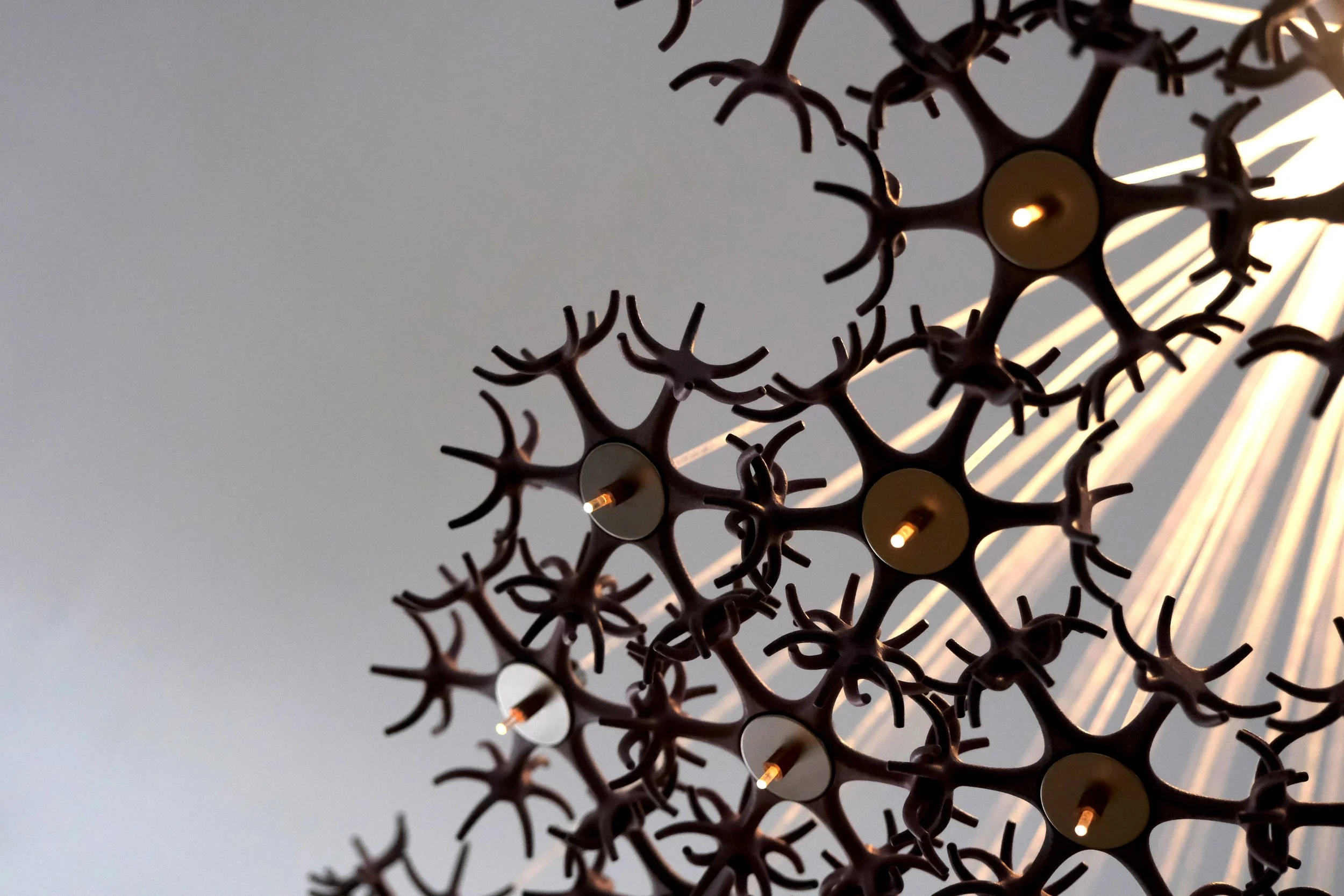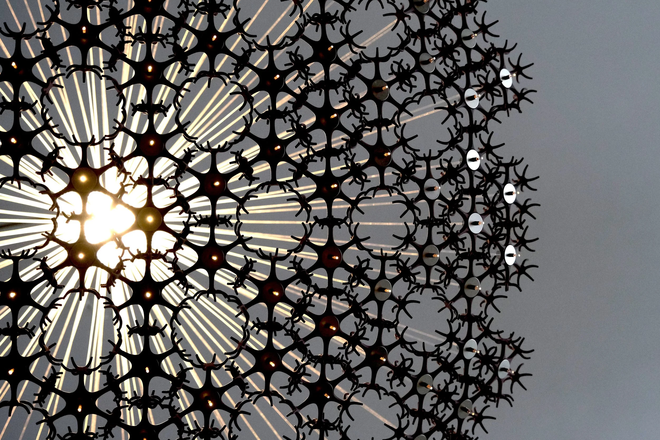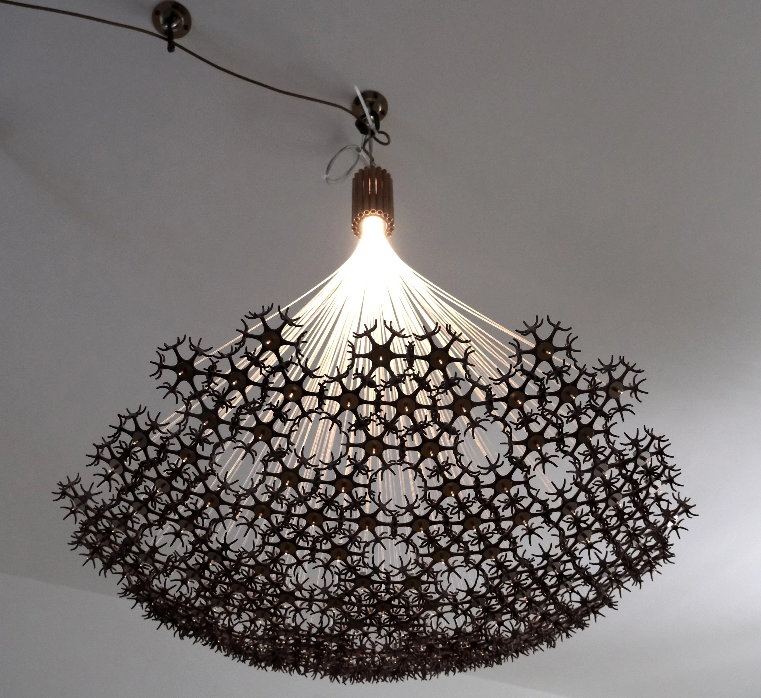 The individual, his thoughts, his being present and alive is represented by the light, placed at the top, inside a first layer, a shell, the flesh, a shell of fibers, the copper tubes. From this branch off many transparent, Plexiglas threads that convey light from the heart of the work to a second stage, the actual boundary, composed of 127 nylon and metal elements that weave into an orderly, yet at the same time chaotic structure, made up of many connections and as many empty spaces. Each of the elements that make up the boundary encloses at its center the final part of each termination that conveys the light produced by the self, to the outside world, setting it in a precise pattern.