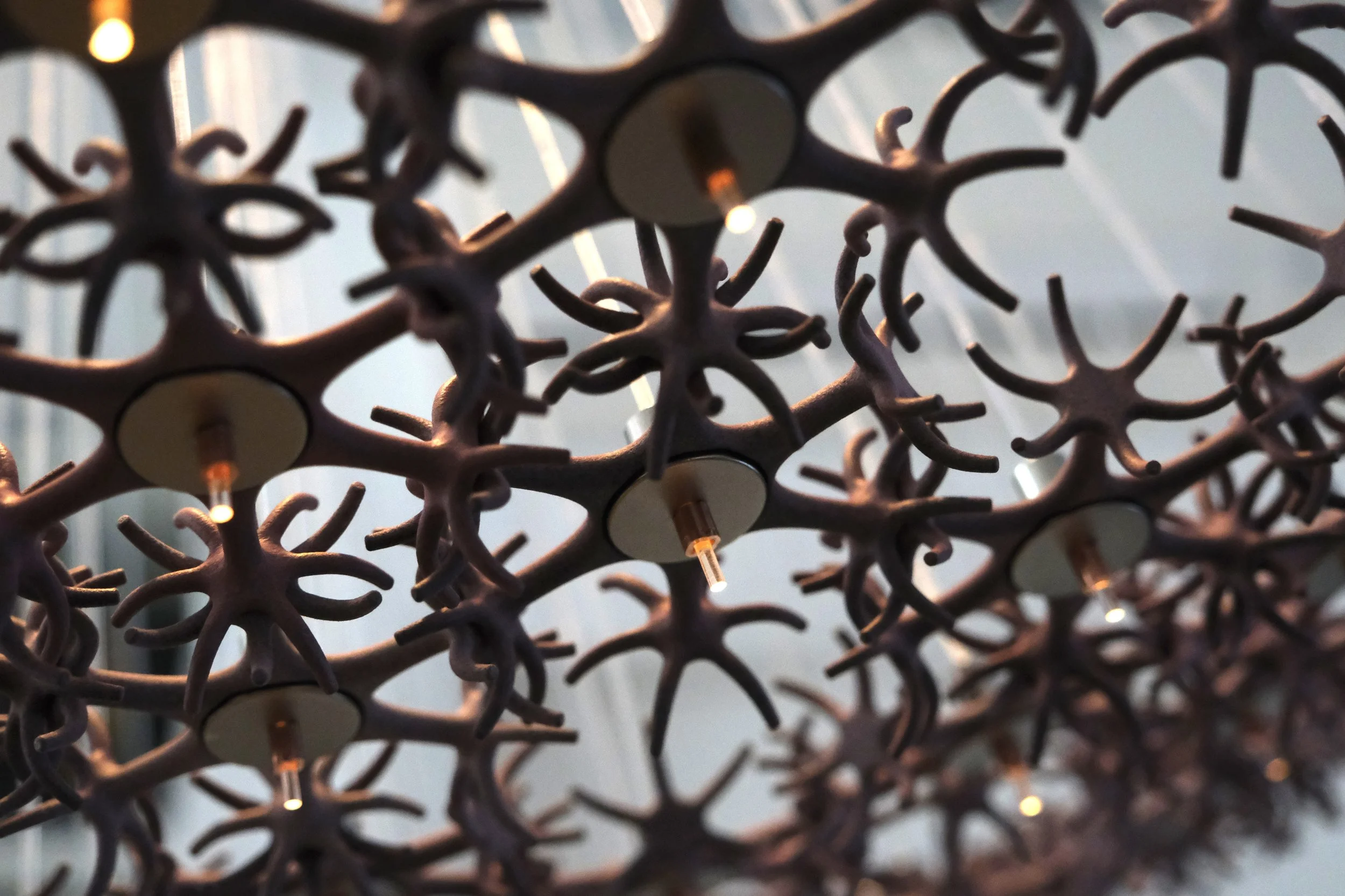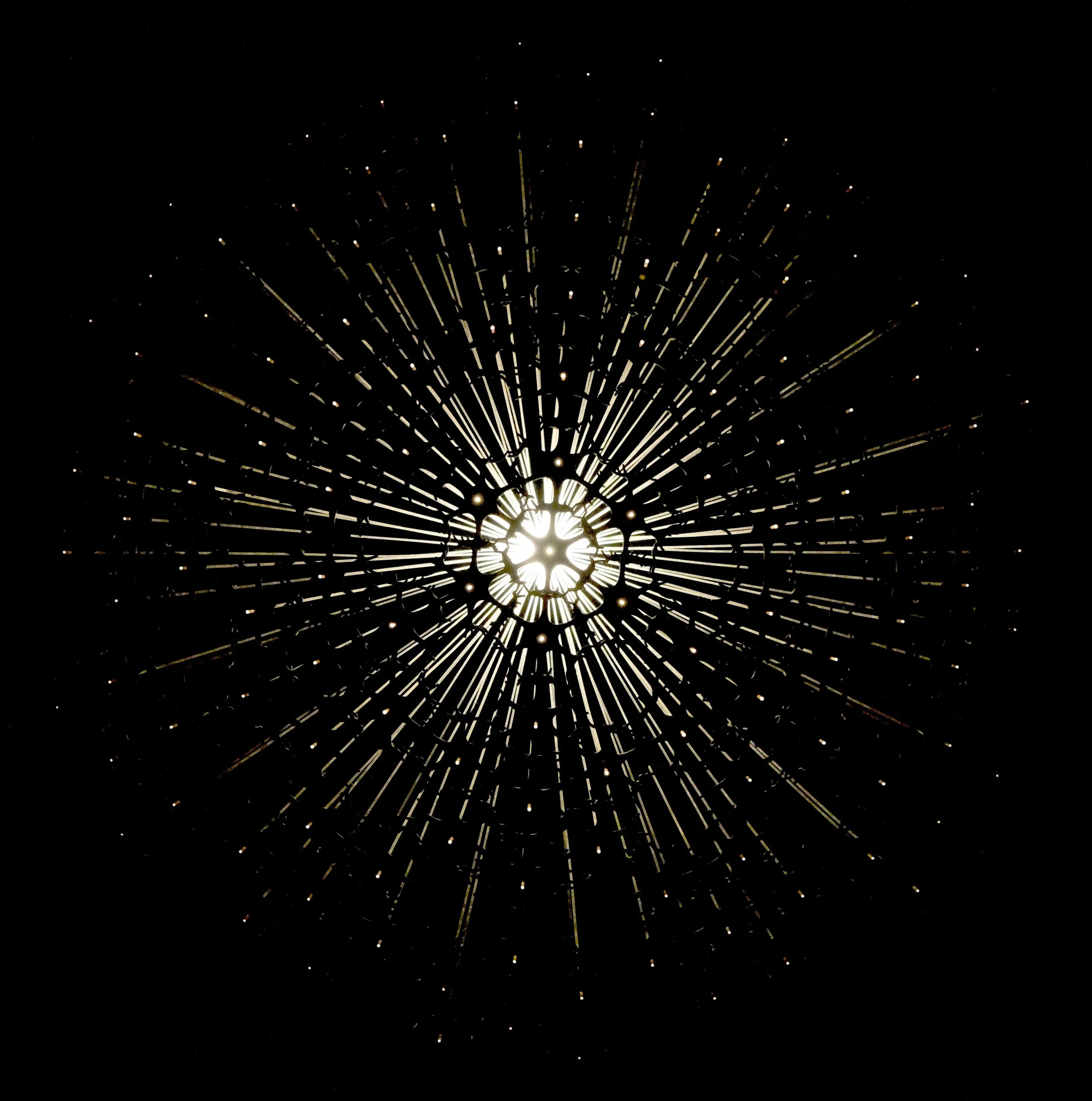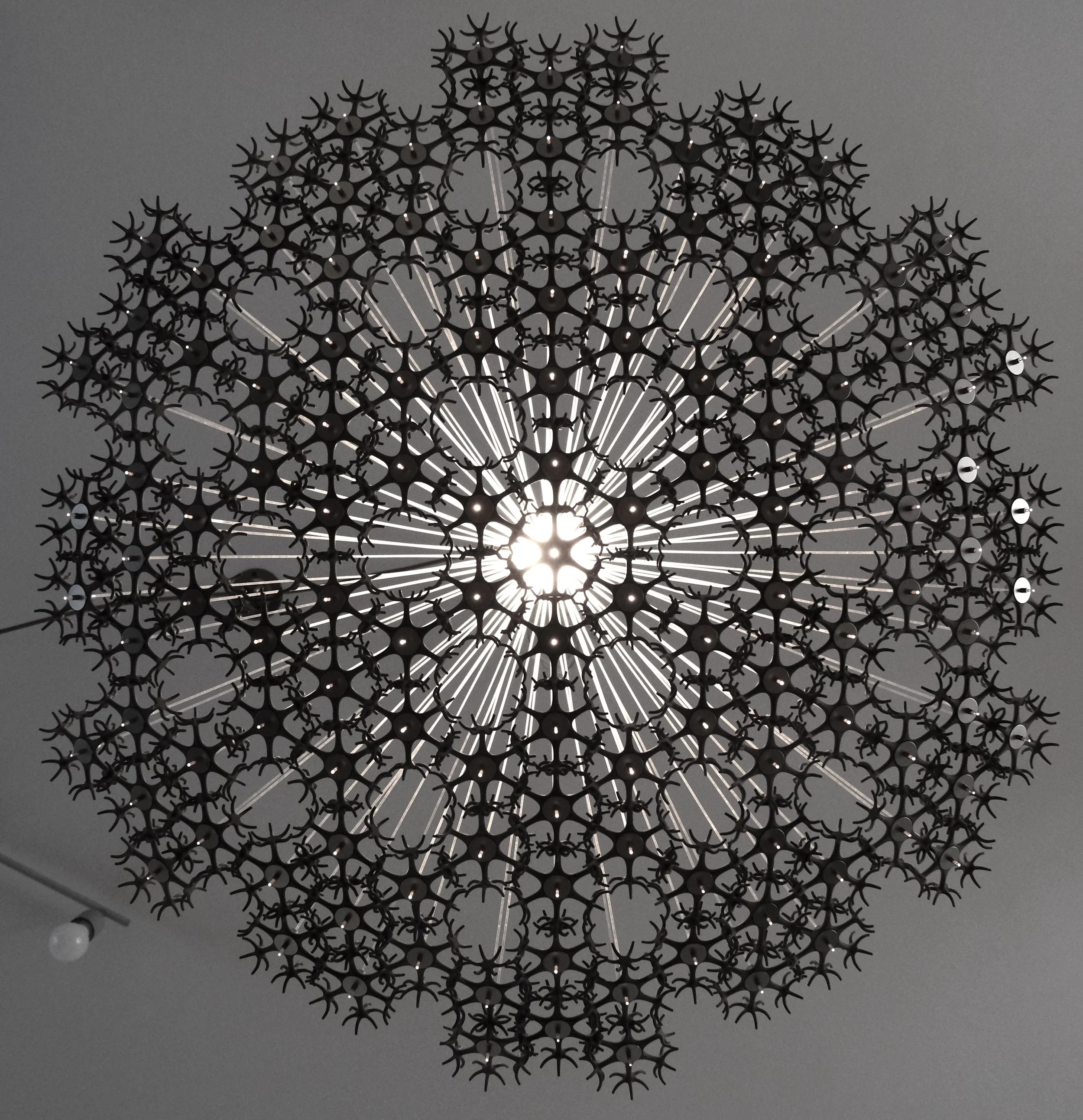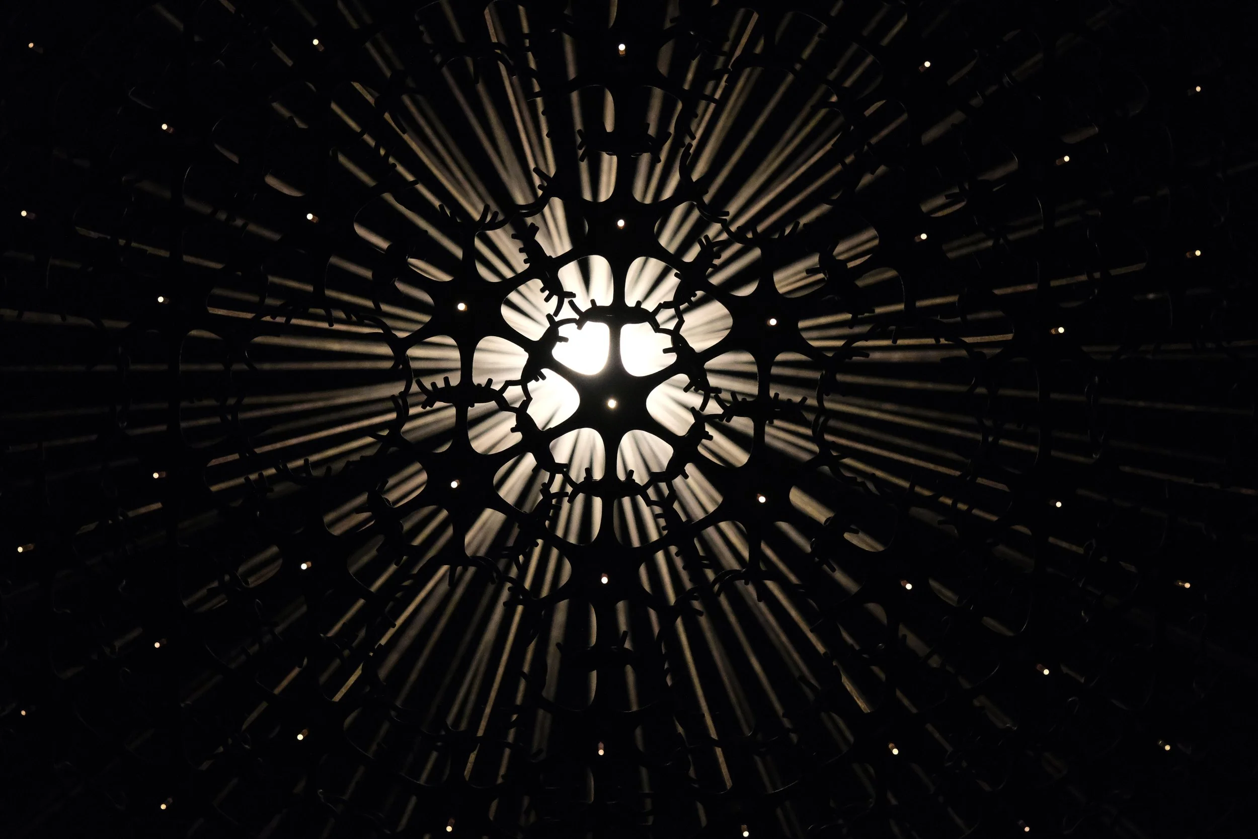 The individual, his thoughts, his being present and alive is represented by the light, placed at the top, inside a first layer, a shell, the flesh, a shell of fibers, the copper tubes. From this branch off many transparent, Plexiglas threads that convey light from the heart of the work to a second stage, the actual boundary, composed of 127 nylon and metal elements that weave into an orderly, yet at the same time chaotic structure, made up of many connections and as many empty spaces. Each of the elements that make up the boundary encloses at its center the final part of each termination that conveys the light produced by the self, to the outside world, setting it in a precise pattern.